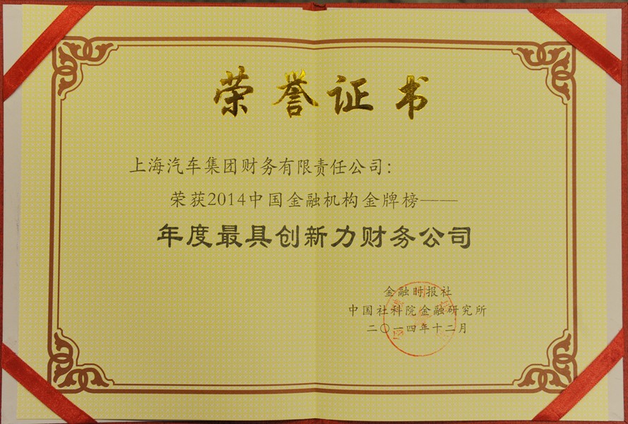 12月26日,從北京傳來喜訊,上汽財務公司在金融時報社和中國社會科學院金融研究所聯(lián)合舉辦的“2014中國金融機構金牌榜‘金龍獎’頒獎盛典”上,憑借創(chuàng)新方面的突出表現(xiàn),榮獲“年度最具創(chuàng)新力財務公司”稱號。