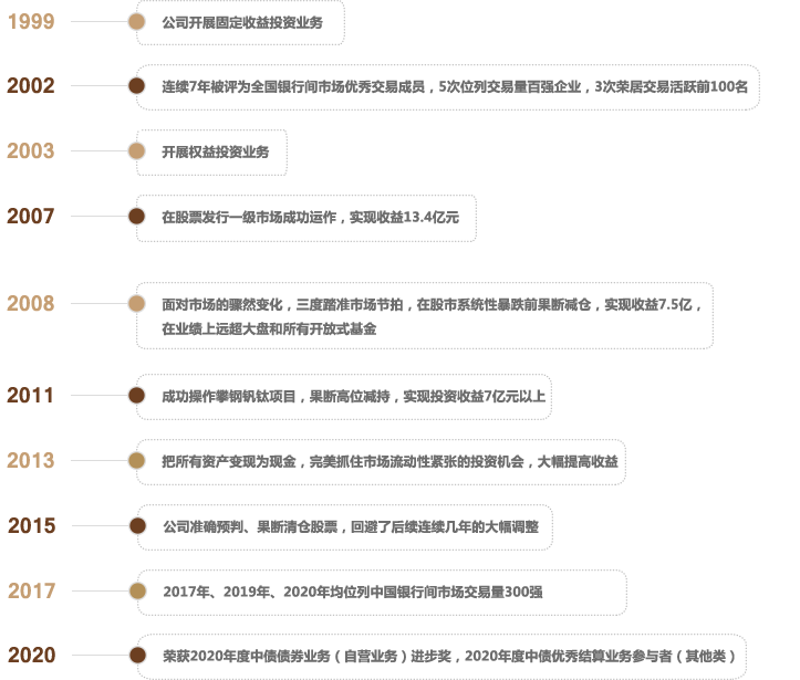 公司聚焦固定收益投資業(yè)務(wù)領(lǐng)域,在確保公司流動(dòng)性的前提下,以“低風(fēng)險(xiǎn)、中收益”為投資目標(biāo),主要投向國債、地方政府債券、金融債券、AAA企業(yè)債券、同業(yè)存單、貨幣市場基金、固定收益類公募基金等品種。多年來始終穩(wěn)健操作,無論是在債券市場趨勢性下跌時(shí),還是在貨幣市場利率巨幅波動(dòng)時(shí),都經(jīng)受住了市場反復(fù)考驗(yàn),實(shí)現(xiàn)了流動(dòng)性、盈利性、低風(fēng)險(xiǎn)的三重目標(biāo)。